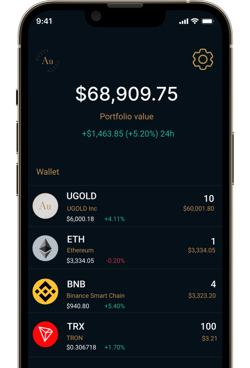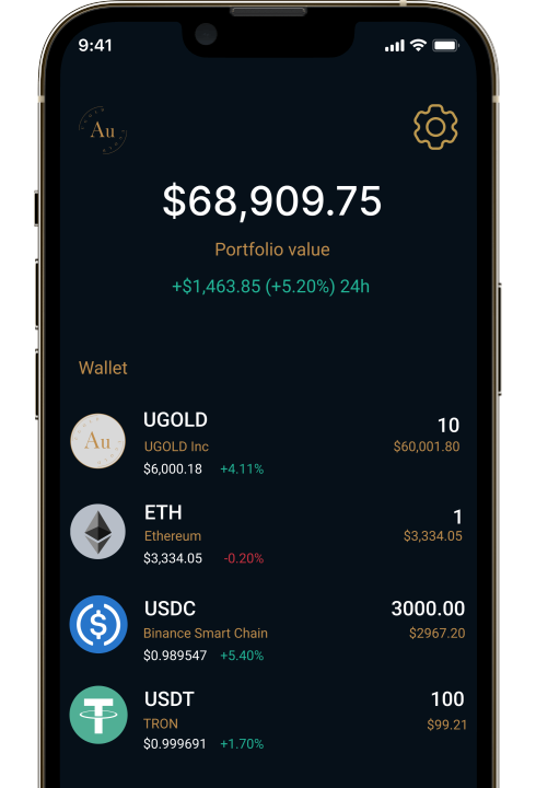 A self-custody wallet forUGOLD, USDC, USDT, ETH, BSC, BTC and TRX.Secure home for all your assets.